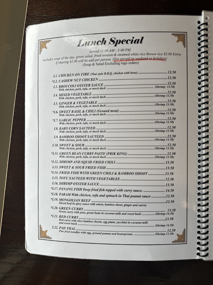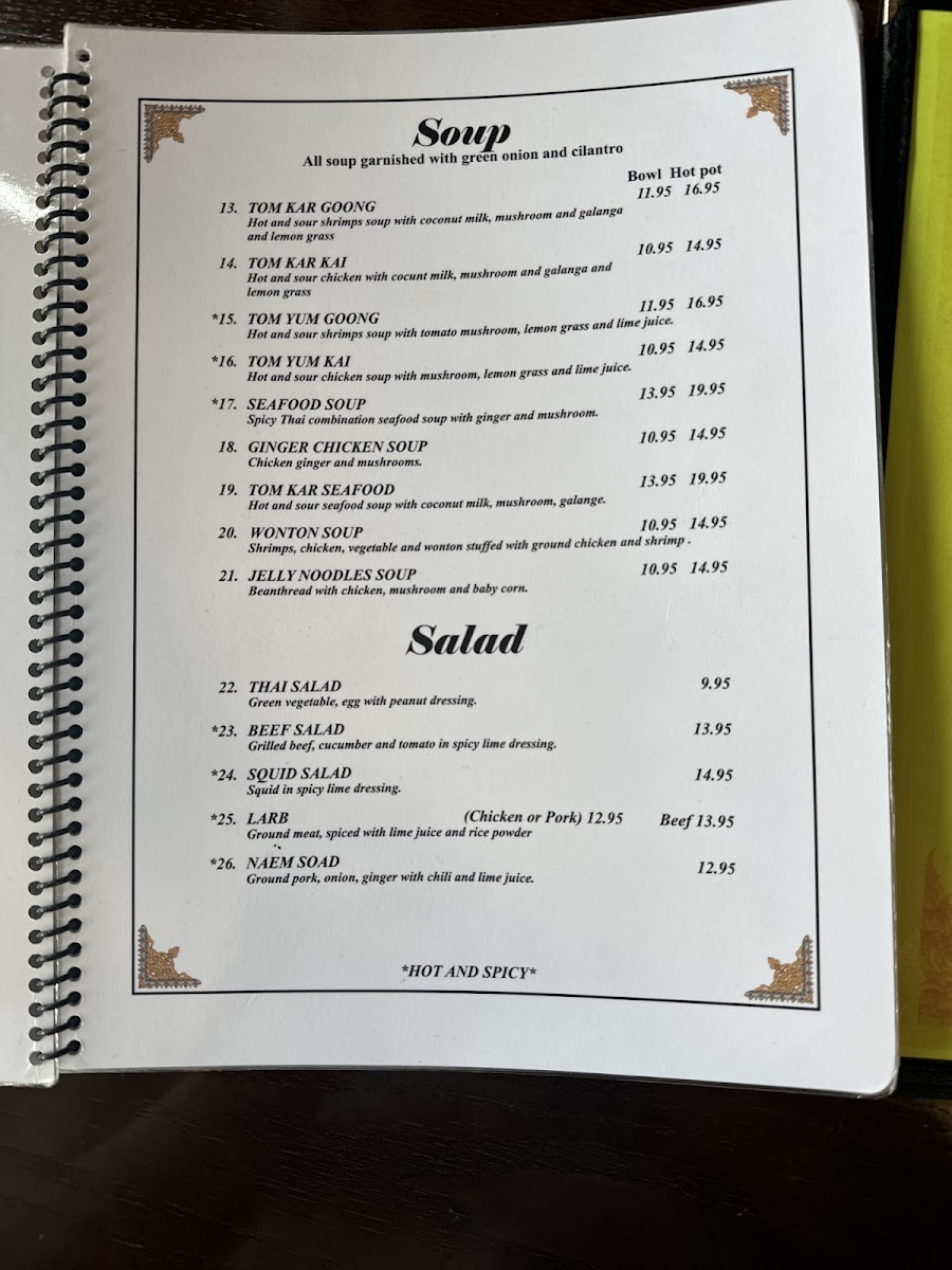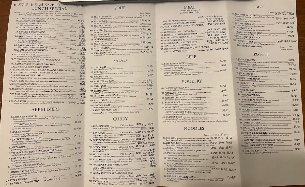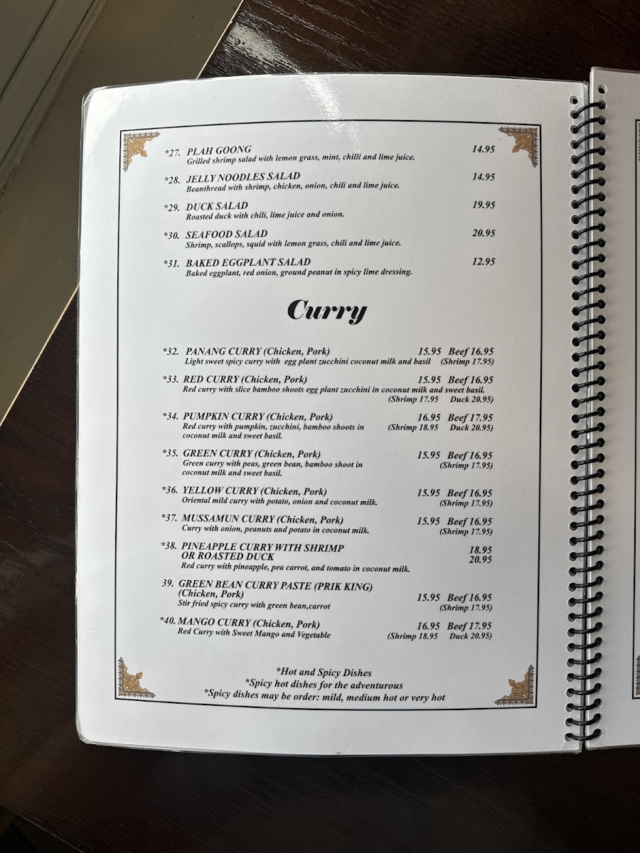 Guests can enjoy thoughtfully prepared classics such as flavorful curries, including the rich Yellow Curry and vibrant Green Curry, alongside lighter options like fresh Spring Rolls and refreshing Larb Salad. Hearty choices like Spicy Fried Rice and Sizzling Seafood provide satisfying meals perfect for those seeking something more substantial, while a variety of soups and vegetable sides complement any selection with gentle warmth.
